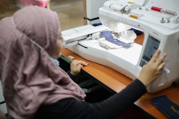 Peserta Bengkel Kraftangan Tanjung Suri, Nurul Wahida Wahab melakukan salah satu proses pembuatan beg tangan dengan mengendali mesin jahitan sulaman jenama pada beg di Taman Puchong Prima, Puchong pada 23 September 2020. Foto HAFIZ OTHMAN/SELANGORKINI