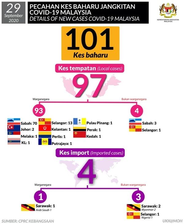 SHAH ALAM, 28 SEPT: Terdapat 101 jangkitan baharu Covid-19 di Malaysia hari ini yang mana Sabah mendahului dengan 73 kes diikuti Selangor dengan 15 kes menjadikan jumlah keseluruhan 11,135, kata ketua pengarah kesihatan.