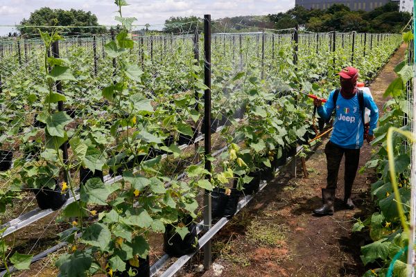 Pekerja Marget Rumansah, 19, menyembur baja cecair yang membantu tumbesaran tanaman timun di ladang yang diusahakan Bumi Suria Tech Sdn Bhd di Jalan Kebun, Shah Alam pada 8 Oktober 2020. Foto ASRI SAPFIE/SELANGORKINI