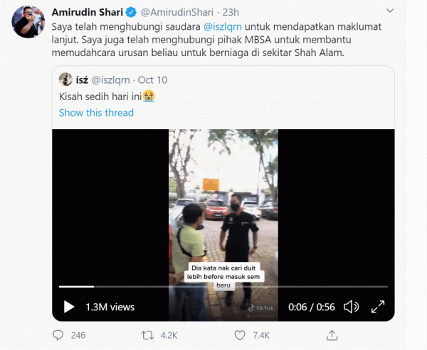 "Saya juga telah menghubungi MBSA untuk membantu memudahcara urusan beliau untuk berniaga di sekitar Shah Alam."