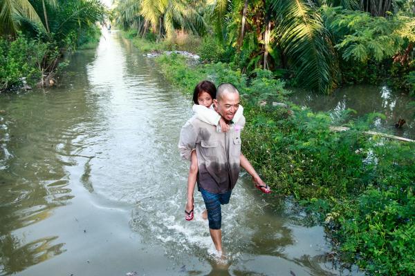 Mohd Helmi Husin, 48, mengangkat anaknya Nia Azzad, 5, keluar daripada rumah mereka yang telah dinaiki air berikutan fenomena air pasang besar di Kampung Sungai Janggut, Klang pada 18 Oktober 2020. Foto ASRI SAPFIE/SELANGORKINI