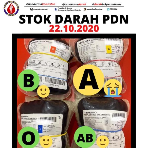 SHAH ALAM, 23 OKT: Kementerian Kesihatan Malaysia (KKM) menyeru orang ramai terutama yang mempunyai darah kumpulan A tampil menderma bagi meningkatkan stok jenis tersebut.