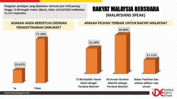 SHAH ALAM, 25 OKT: Sebanyak 77.39 peratus rakyat tidak bersetuju dengan pengisytiharan darurat di negara ini yang menjadi spekulasi sejak beberapa hari lalu.