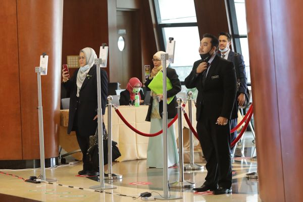 Petugas Dewan menggunakan alat imbasan muka dan pemeriksaan suhu badan sebelum memasuki dewan persidangan Negeri Selangor, Shah Alam pada 3 November 2020. Foto FIKRI YUSOF/SELANGORKINI