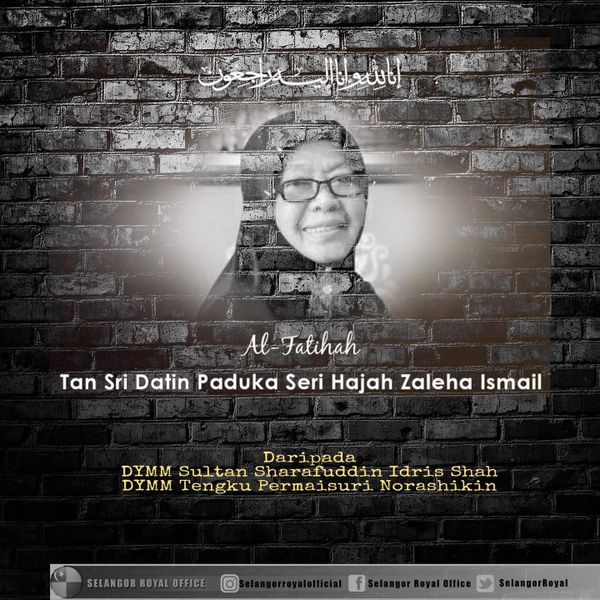 SHAH ALAM, 15 NOV: Duli Yang Maha Mulia (DYMM) Sultan Selangor dan DYMM Tengku Permaisuri Selangor menzahirkan ucapan takziah atas pemergian Tan Sri Datin Paduka Seri Zaleha Ismail malam tadi.