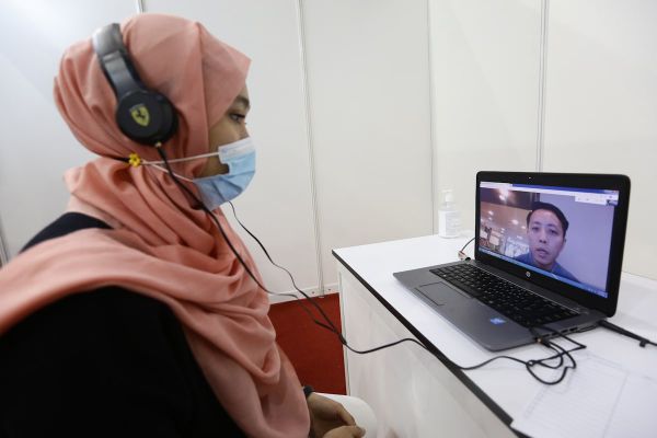 Salah seorang peserta ketika sesi temu duga secara maya pada program Jelajah Selangor Bekerja 2020 di Stadium Tertutup Kuala Selangor pada 15 November 2020. Foto HAFIZ OTHMAN/SELANGORKINI