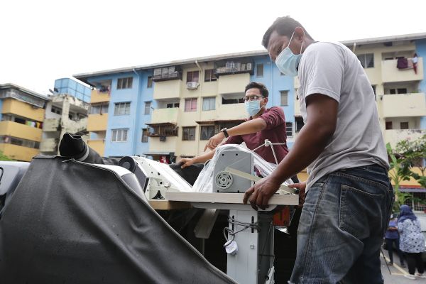 Kakitangan Hijrah Selangor sedang mengangkat mesin jahit yang akan diberi kepada penerima Geran Peralatan SITHAM di Seksyen 20, Shah Alam pada 18 November 2020. Foto HAFIZ OTHMAN/SELANGORKINI