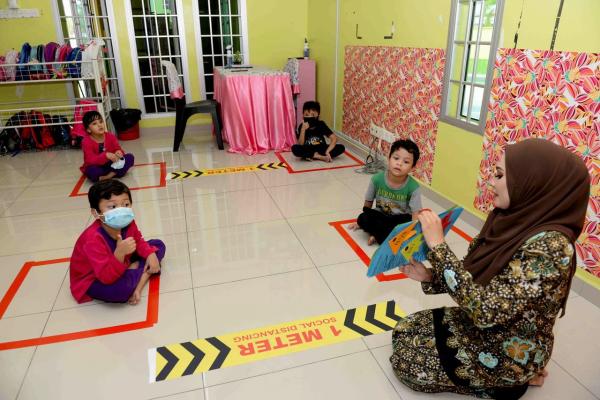 Pengetua Tadika Big Apple Cawangan Kinta Riverfront, Rohani Hasshim (tengah) melakukan aktiviti pembelajaran bersama kanak-kanak di Tadika Big Apple pada 1 Julai 2020. Foto BERNAMA[/caption]