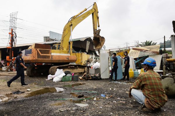 Kakitangan penguat kuasa Majlis Perbandaran Selayang (MPS) sedang memantau kerja - kerja perobohan premis yang didirikan tanpa kebenaran atas rizab lembangan Sungai Selangor di Rawang pada 8 Disember 2020. Foto HAFIZ OTHMAN/SELANGORKINI