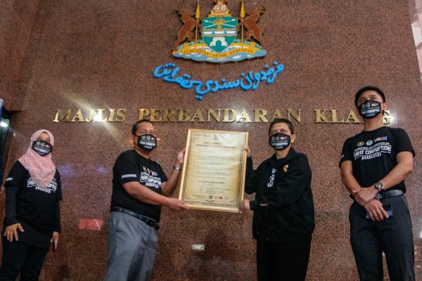 Yang Dipertua Majlis Perbandaran Klang (MPK) Dr Ahmad Fadzli Ahmad Tajuddin bersama Timbalan Pengarah (Pencegahan) Suruhanjaya Pencegahan Rasuah Malaysia (SPRM) Negeri Selangor Abdul Razak Deraof bergambar bersama bingkai janji memerangi rasuah sempena Sambutan Hari Anti Rasuah Antarabangsa (HARA2020) peringkat Selangor di Bangunan MPK, Klang pada 9 Disember 2020. Foto ASRI SAPFIE/SELANGORKINI