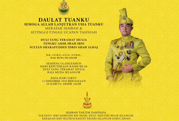 SHAH ALAM, 12 DIS: Dato' Menteri Besar menyampaikan ucapan selamat sempena Ulang Tahun Keputeraan Duli Yang Teramat Mulia Raja Muda Selangor, Tengku Amir Shah Ibni Sultan Sharafuddin Idris Shah Alhaj.