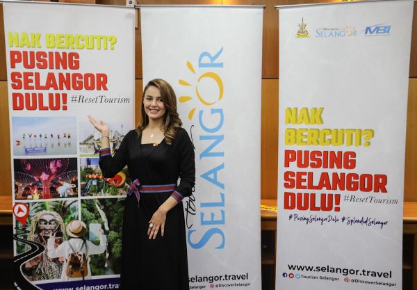 Duta Kempen, Che Puan Juliana Evans bersama gegantung promosi kempen ‘Pusing Selangor Dulu’ di Bilik Mesyuarat MTES, Bangunan Sultan Salahudin Abdul Aziz Shah pada 17 Disember 2020. Foto FIKRI YUSOF/SELANGORKINI