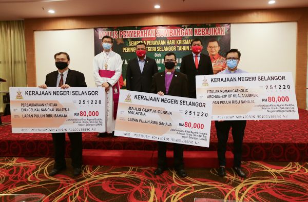 Menteri Besar Selangor, Dato' Seri Amirudin Shari (tengah) bersama Exco Kerajaan Negeri Selangor, Hee Loy Sian (dua, kanan) dan Uskup Agung, Julian Leow Beng Kim (dua, kiri) bergambar bersama wakil - wakil gereja selepas Majlis Penyerahan Sumbangan Kebajikan Sempena Perayaan Krismas Peringkat Negeri Selangor Tahun 2020 turut sama di Dewan Jubli Perak, Shah Alam pada 21 Disember 2020. Foto HAFIZ OTHMAN/SELANGORKINI
