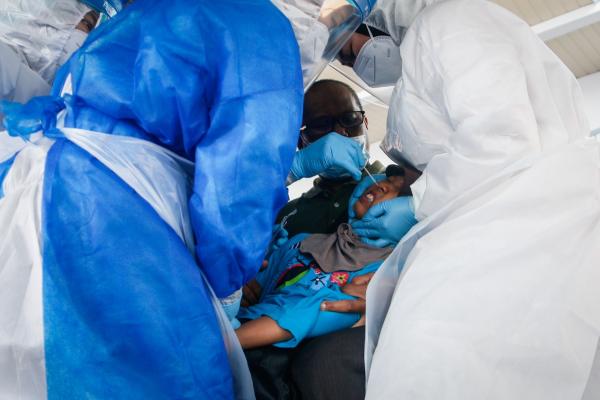Nor Aliya Maisara Jalani, 11, ditenangkan bapanya ketika menjalani ujian calitan dalam program saringan komuniti Covid-19 Taman Sri Muda, Shah Alam pada 7 Januari 2021. Foto ASRI SAPFIE/SELANGORKINI