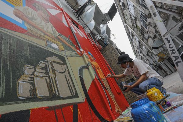 Pelukis mural, Abdul Rahman Aliakbar, 24, sedang mewarna mural ketika kerja membaikpulih dan pengindahan lorong belakang kedai di Jalan Mamanda 2, Ampang pada 9 Januari 2021. Foto FIKRI YUSOF/SELANGORKINI