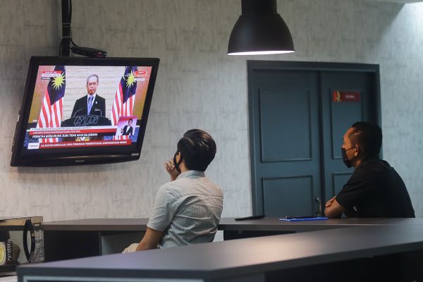 Kakitangan Media Selangor sedang menonton siaran langsung Pengumuman Khas Darurat oleh Perdana Menteri, Tan Sri Muhyiddin Yassin di Menara Bank Rakyat, Shah Alam pada 12 Januari 2021. Foto HAFIZ OTHMAN/SELANGORKINI