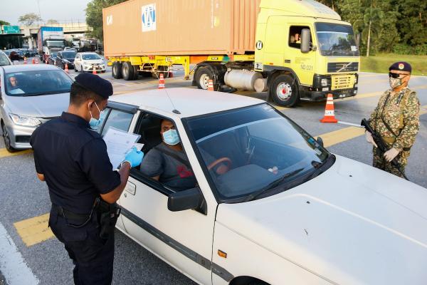 Anggota polis memeriksa dokumen merentas negeri daripada salah sebuah kenderaan ketika sekatan jalan raya diadakan di Plaza Tol Bukit Jelutong, Shah Alam pada 16 Januari 2021. Foto ASRI SAPFIE/SELANGORKINI
