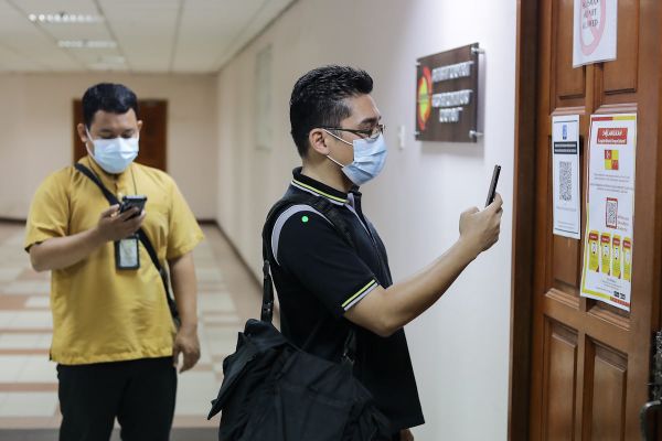 Penjawat awam mengimbas kod QR menggunakan sistem SELangkah (Langkah Masuk Dengan Selamat) sebelum memasuki pejabat di Bangunan SUK Shah Alam pada 22 Januari 2021. Foto FIKRI YUSOF/SELANGORKINI