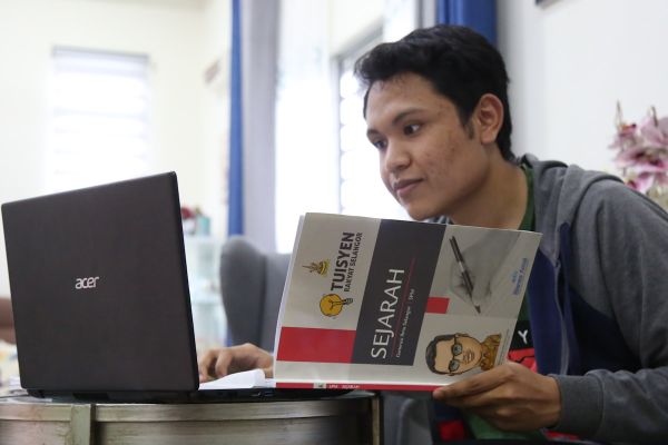 Calon Sijil Pelajaran Malaysia (SPM) dari Sekolah Menengah Kebangsaan (SMK) Jenjarom, Mohamad Ikwan Adam Azha, 18, mengikuti kaedah dan teknik menjawab soalan peperiksaan melalui portal Program Tuisyen Rakyat Selangor (PTRS) di kediamannya di Jenjarom, Kuala Langat, Banting pada 4 Februari 2021. Foto REMY ARIFIN/SELANGORKINI