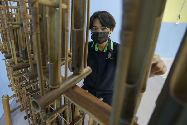 Muhammad Zulfikar Nor, 16, menunjukkan cara bermain angklung ketika program Jelajah Rentak Selangor di Sekolah Sri Pintar, Shah Alam pada 20 Februari 2021. Angklung adalah alat muzik diperbuat daripada buluh dan menghasilkan bunyi dengan cara kedua bahagiannya berlaga ketika ia digetarkan. Foto FIKRI YUSOF/SELANGORKINI