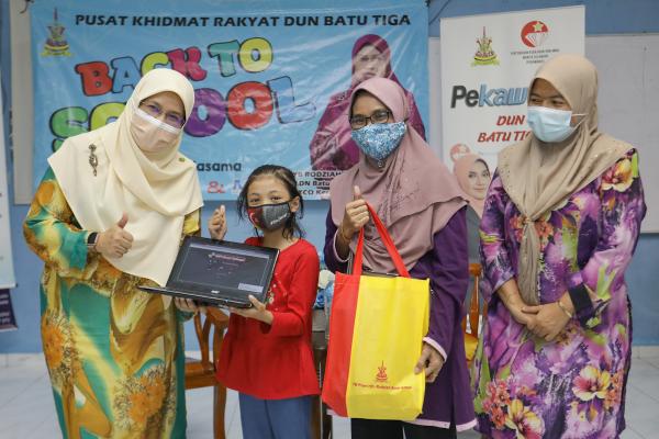 Wakil rakyatnya Rodziah Ismail berkata bantuan meliputi wang tunai dan barangan persekolahan seperti tali pinggang, stoking serta kapur kasut selain 50 komputer riba.