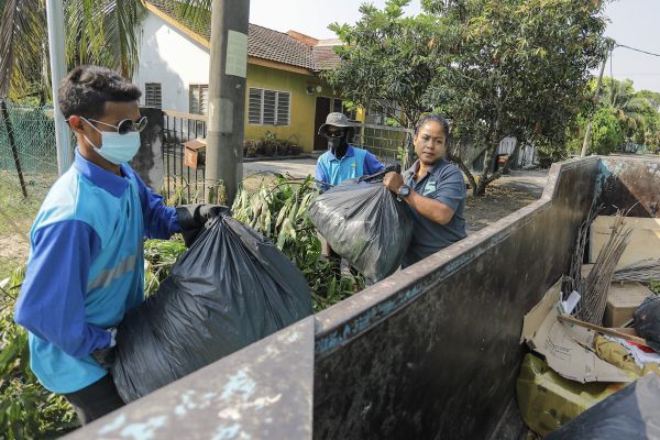Pemandu lori wanita KDEB Waste Management, Zubaidah Riduan, 44 (kanan) membantu rakan sekerja mengangkat sampah ke dalam lori di Taman Rahmat Jaya, Rawang pada 2 Mac 2021. Foto FIKRI YUSOF/SELANGORKINI