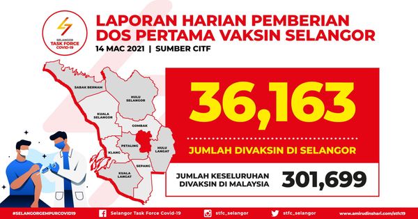 SHAH ALAM, 15 MAC: Selangor kekal negeri tertinggi menerima suntikan vaksin dalam kumpulan fasa pertama program imunisasi kebangsaan membabitkan 36,163 individu setakat semalam.