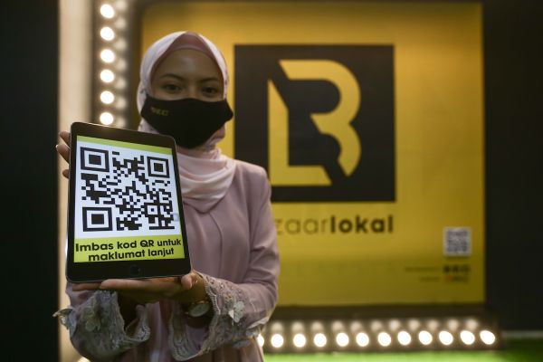 Kakitangan PKNS, menunjukkan kod QR Bazaarlokal selepas Majlis Perasmian Platform Beli-Belah Atas Talian Bazaarlokal dan Festival Ramadan Selangor 2021 (FESTIRA'21) di SACC Mall, Shah Alam pada 2 April 2021. Foto HAFIZ OTHMAN/SELANGORKINI