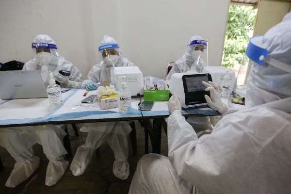 Petugas Kesihatan Selcare melakukan analisa kepada sampel Covid-19 ketika program Ujian Saringan Komuniti secara bersasar di Dewan Serbaguna Seksyen 7, Bandar Baru Bangi pada 4 April 2021. Foto HAFIZ OTHMAN