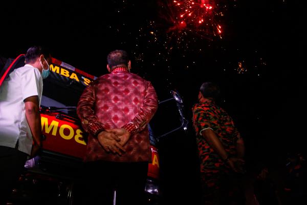 ADN Paya Jaras Khairuddin Othman (tengah) menyaksikan percikan bunga api usai majlis penyerahan kereta bomba kepada Pasukan Bomba Sukarela Saujana Utama di Dewan MDKS, Sungai Buloh pada 9 April 2021. Foto ASRI SAPFIE/SELANGORKINI