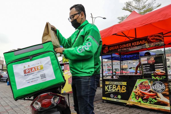 Penghantar makanan, Mohd Afie Ikmal Jamal, 34, mengambil pesanan di gerai peniaga ketika majlis Pelancaran Platform Selangor (PLATS) 2.0 Selangor e-Dapur dan e-Pembekalan Peruncit Mikro dan Kecil di Stadium Majlis Perbandaran Selayang, Batu Caves pada 11 April 2021. Platform Selangor atau PLATS dibangunkan untuk menggerakkan ekonomi penjaja dan peruncit Selangor. Aspirasinya adalah untuk membina komuniti yang merancakkan ekonomi penjaja dan peruncitan Selangor melalui platform digital bersama. Foto FIKRI YUSOF/SELANGORKINI