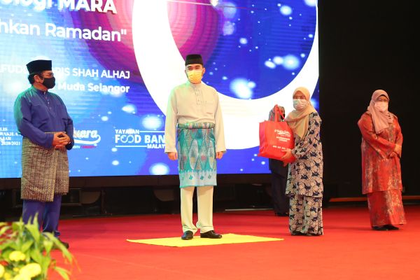 Raja Muda Selangor, Tengku Amir Shah berkenan bergambar bersama penerima sumbangan bakul makanan sempena program Belia Juara Ramadan di Dewan Agung Tuanku Canselor UiTM, Shah Alam pada 1 Mei 2021. Foto REMY ARIFIN/SELANGORKINI