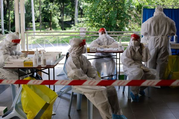 Petugas Kesihatan Selcare sedang berehat sementara menunggu orang ramai hadir membuat ujian calitan ketika Saringan Komuniti Covid-19 di Dewan Merdeka Kuala Kubu Bharu, Hulu Selangor pada 8 Jun 2021. Foto HAFIZ OTHMAN/SELANGORKINI