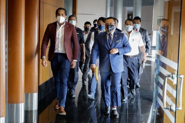 Dato' Menteri Besar Selangor, Dato' Seri Amirudin Shari (kanan) bersama Menteri Penyelaras Program Imunisasi Covid-19 Kebangsaan Khairy Jamaluddin Abu Bakar (kiri) berjalan masuk ke dewan sebelum mempengerusikan bersama Mesyuarat Badan Bertindak Program Imunisasi Covid-19 Kebangsaan Peringkat Negeri Selangor di Bangunan Annex Dewan Negeri Selangor, Shah Alam pada 15 Jun 2021. Foto HAFIZ OTHMAN/SELANGORKINI