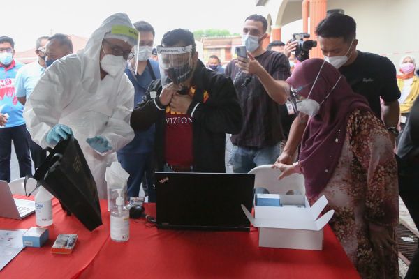 Dato’ Menteri Besar, Dato’ Seri Amirudin Shari diberi penerangan berhubung penggunaan kit pemantauan kendiri di rumah bagi pesakit Covid-19 oleh petugas kesihatan Klinik Selcare ketika meninjau program Saringan Komuniti percuma di Dewan Beringin, Taman Seri Gombak pada 20 Jun 2021. Foto REMY ARIFIN/SELANGORKINI