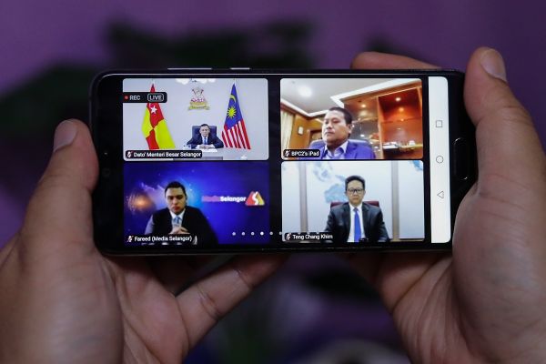 Dato' Menteri Besar, Dato' Seri Amirudin Shari (kiri, atas) berucap ketika pengumuman keputusan e-Bazar Raya dan pelancaran Sidec TV secara maya pada 23 Jun 2021. Foto FIKRI YUSOF/SELANGORKINI