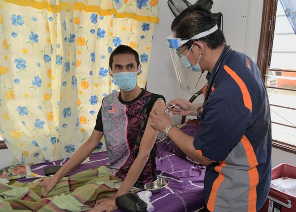 MERSING, 3 JULAI: Seorang lelaki Orang Asli yang lumpuh separuh badan sejak 28 tahun lepas meluahkan rasa syukur dan terharu apabila diberikan suntikan vaksin di rumahnya semalam.