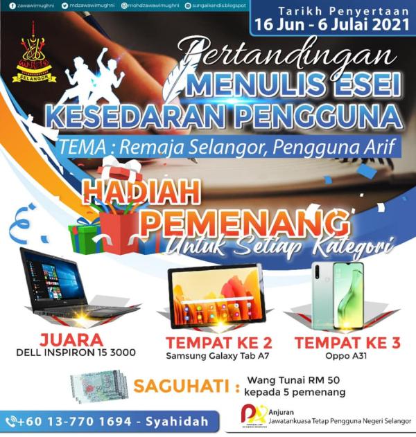 "Juara akan bawa pulang komputer riba, tempat kedua Samsung Galaxy Tab A7, tempat ketiga telefon pintar OPPO A31. Wang tunai RM50 untuk lima pemenang saguhati," katanya ketika dihubungi.