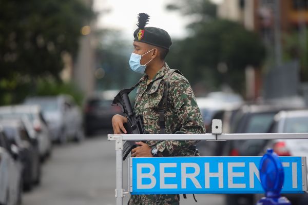 Anggota Angkatan Tentera Malaysia (ATM) mengawal ketat pintu masuk pangsapuri yang dikenakan Perintah Kawalan Pergerakan Diperketatkan (PKPD) di PPR Seri Semarak, Kuala Lumpur pada 4 Julai 2021. Kerajaan melaksanakan Perintah Kawalan Pergerakan Diperketatkan (PKPD) di seluruh Selangor dan beberapa lokaliti di Wilayah Persekutuan Kuala Lumpur dibawah Pelan Pemulihan Negara (PPN). Foto HAFIZ OTHMAN/SELANGORKINI