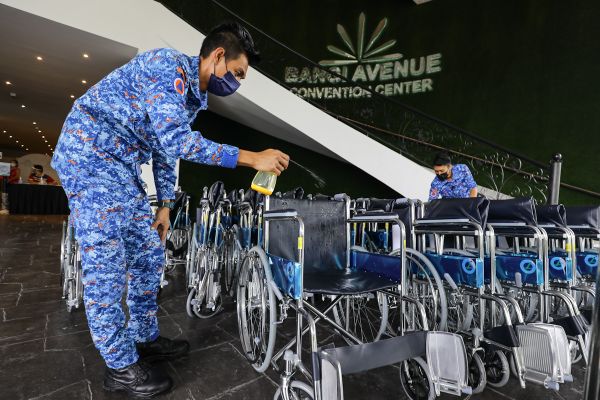 Anggota Angkatan Pertahanan Awam Malaysia (APM), Mohd Naim Buges, 33, menyembur cairan pembasmi kuman pada kerusi roda yang telah digunakan penerima vaksin untuk memastikan ianya selamat bagi pengguna lain ketika tinjauan SelangorKini di pusat pemberian vaksin (PPV) Bangi Avenue Convention Centre, Bangi pada 10 Julai 2021. Foto FIKRI YUSOF/SELANGORKINI