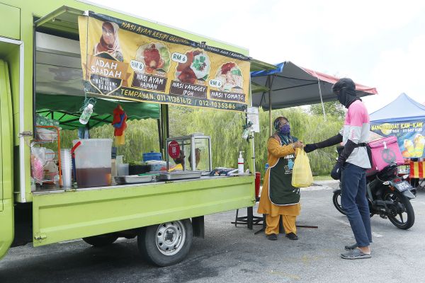 Norsadah Zainudin (kanan) menyerahkan bungkusan nasi kepada pelanggan[/caption]