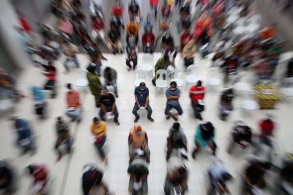 Orang ramai menunggu giliran untuk mendaftar suntikan vaksin Covid-19 semasa program Vaksin Selangor (Selvax) DUN Seri Serdang di Pusat Pemberian Vaksin (PPV) Aurora Place Bukit Jalil pada 28 Julai 2021. Foto AHMAD ZAKKI JILAN/SELANGORKINI