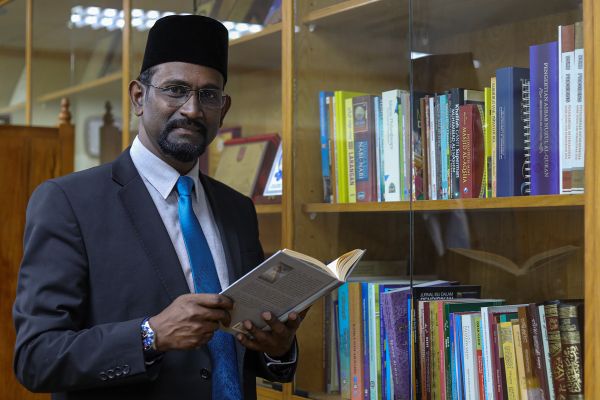 Farid Ravi membaca sebahagian koleksi buku yang disimpan di pejabatnya di Kolej Universiti Islam Selangor, Kajang[/caption]
