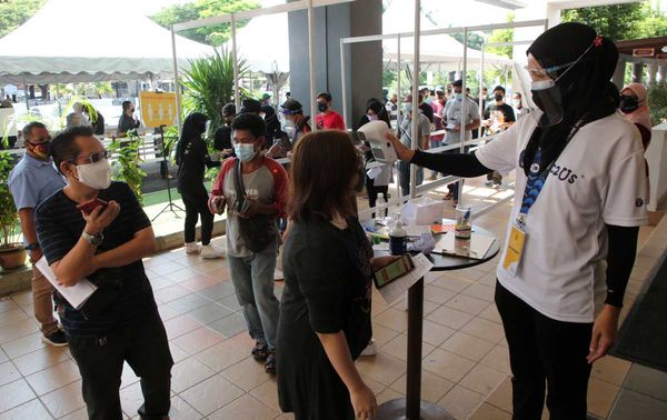 Sukarelawan Troopers mengimbas suhu orang ramai sebelum dibenarkan memasuki dewan bagi menerima suntikan pelalian dalam program Vaksin Selangor (Selvax) Komuniti DUN Sementa di Hotel De Palma Shah Alam pada 11 Ogos 2021. Foto AHMAD ZAKKI JILAN/SELANGORKINI