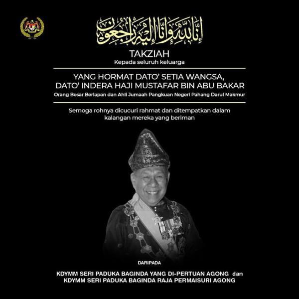 KUALA LUMPUR, 13 OGOS: Yang di-Pertuan Agong Al-Sultan Abdullah Ri'ayatuddin Al-Mustafa Billah Shah menzahirkan ucapan takziah kepada seluruh keluarga Orang Besar Berlapan dan Ahli Jumaah Pangkuan Negeri Pahang Darul Makmur Dato’ Setia Wangsa Dato’ Indera Mustafar Abu Bakar yang meninggal dunia hari ini.