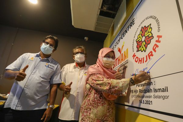Exco Kerajaan Negeri, Rodziah Ismail (tengah), menandatangani plat sebagai gimik perasmian One Stop Centre Sitham ketika Majlis penyerahan geran peralatan Sitham Yayasan Hijrah Selangor di Taman Melur, Ampang pada 14 Ogos 2021. Sitham adalah satu Program Pembangunan Usahawan India Selangor yang bertujuan bagi menaiktaraf kehidupan dan ekonomi menerusi janaan pendapatan melalui kemahiran sendiri. Foto HAFIZ OTHMAN/SELANGORKINI