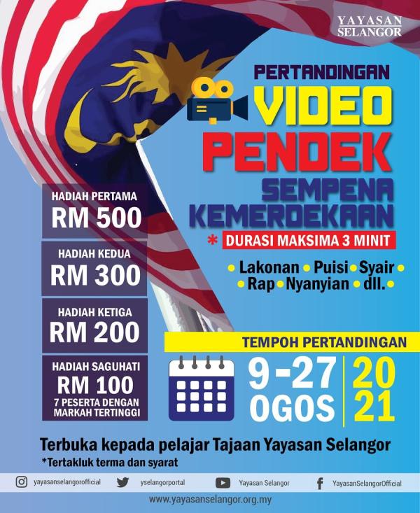SHAH ALAM, 20 OGOS: Pelajar tajaan Yayasan Selangor (YS) berpeluang menang hadiah wang tunai keseluruhan RM1,700 dalam pertandingan menghasilkan video pendek sempena bulan kemerdekaan negara ke-64.