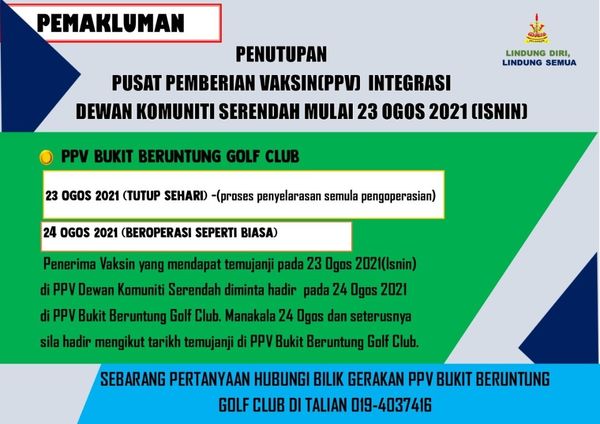 SHAH ALAM, 22 OGOS: Pusat pemberian vaksin (PPV) Dewan Komuniti Serendah akan ditutup mulai esok, maklum Pusat Khidmat Rakyat Penyelaras Dewan Undangan Negeri (DUN) Batang Kali.
