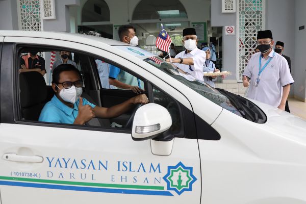 Seorang kakitangan Yayasan Islam Darul Ehsan (Yide) menunjukkan isyarat bagus selepas sesi penyerahan dan melekat Jalur Gemilang pada kenderaan anak syarikat Mais di Lobi Bangunan Sultan Idris Shah, Shah Alam pada 25 Ogos 2021. Foto REMY ARIFIN/SELANGORKINI