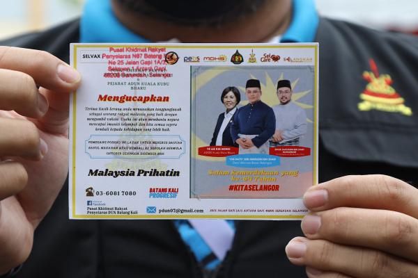 HULU SELANGOR, 29 OGOS: Sebanyak 1,000 poskad penghargaan diedar kepada penerima suntikan pelalian pada program Vaksin Selangor (Selvax) Komuniti Dewan Undangan Negeri (DUN) Batang Kali.